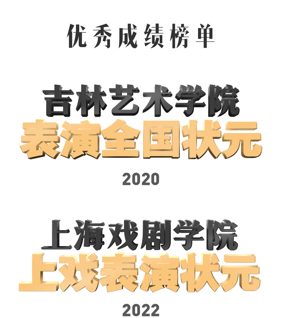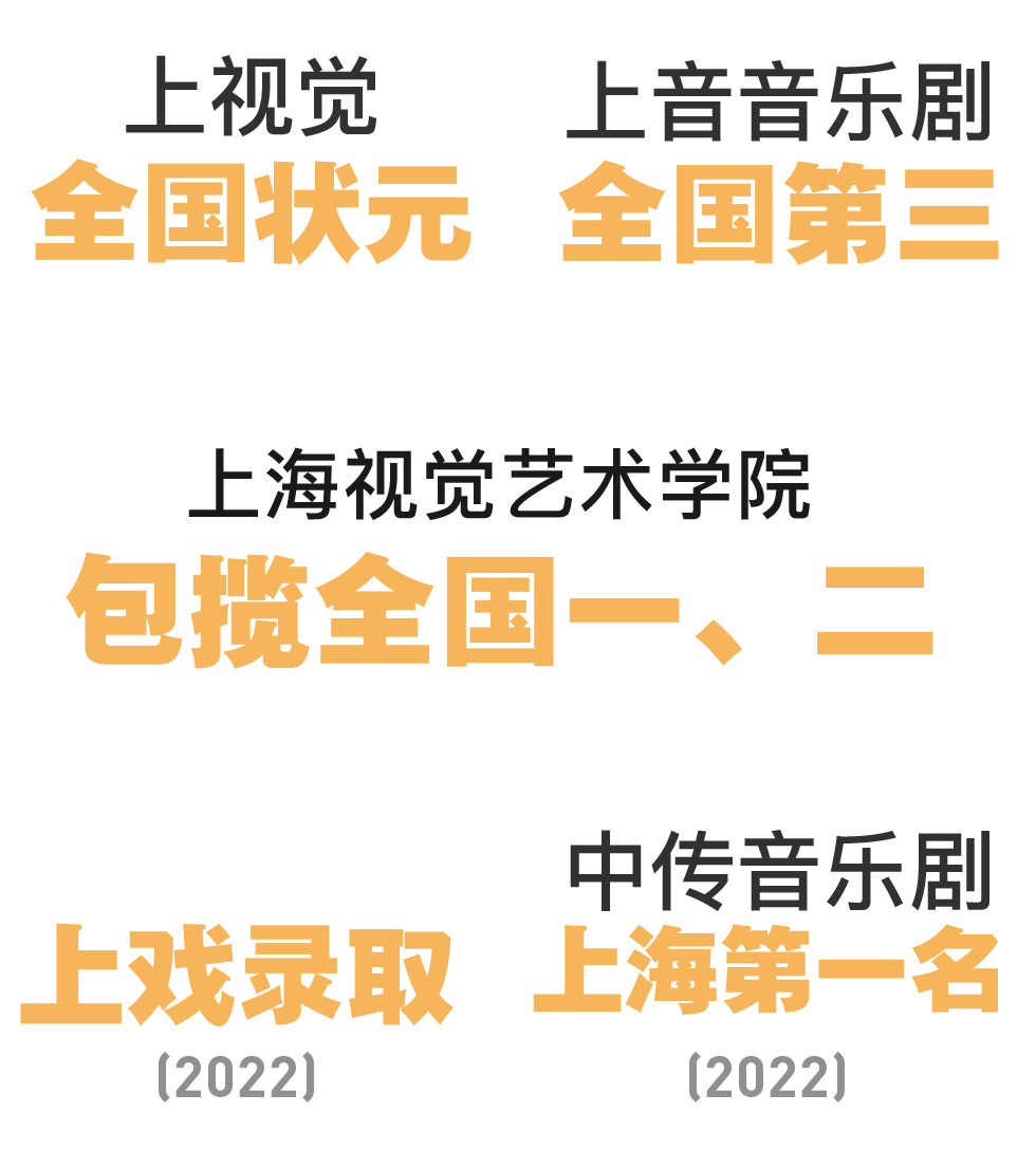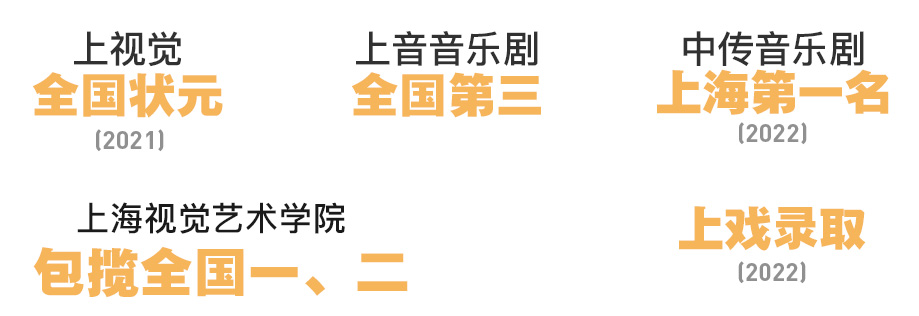 2022年表演班学员朱辰悦,斩获上海戏剧学院(春招)表演专业第一名的好成绩,力夺五个预录取资格中的一个宝贵名额!2022年上海印象学员邵雨欣获得中国传媒大学音乐剧表演专业上海市第一名。
