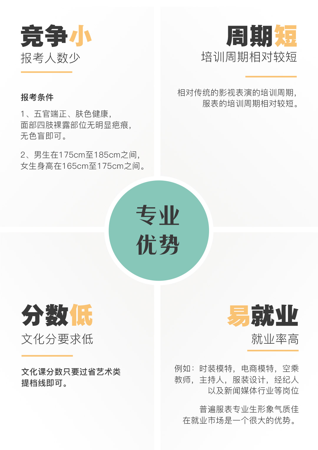 印象服装表演专业设有模特形体塑造、镜前平面展示、泳装台步展示、艺考才艺辅导、化妆与发型等课程,服装表演作为艺考中的小众专业,具有人数少、竞争小的优势,目前开设服表类专业有浙江理工大学、东华大学、北京服装学院、中华女子学院、天津工业大学、南京传媒学院、上海视觉艺术学院等知名院校。