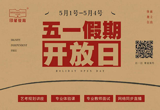 而由于清明节开放日火爆异常,杭州印象国际艺术教育将于2019年5月1日-4日再一次举办「校园开放日」活动,让更多的家庭能够了解艺考,了解印象。