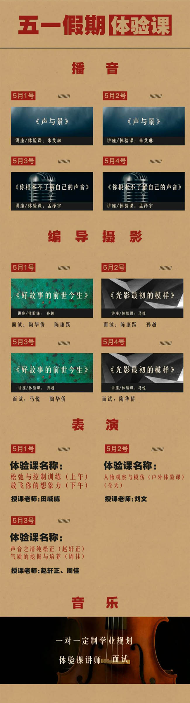 虽然都是体验课,但是我只能说我们不一样!不一样! 第一体验课授课老师是考前班教授课程的专业教师,都是全专职化教师团队,保证教学体验的完备性。不必劳心挂念是否体验课上观感上佳的授课教师会仅仅只有「一面之缘」。 第二体验课的质量与正式课程质量一样,不夸大名师,不归功于个人,坚持根据教学质量进行岗位淘汰和换血,坚决杜绝兼职教师无管理和松散上课的现象。 那么体验课究竟上什么呢?不用怕,我们这就把体验课程的海报呈上来,这样大家就可以了解各专业都有什么样的活动啦! 我们必须要强调的是,绝对不是所有学生都适合学习艺术专业,也绝对不是所有专业都只有一个评判标准。 我们的面试通过率从来都不是百分之百! 语音面貌、即兴表达、思维拓展、电影阅片量、阅读量、形体、声乐、交流状态、整体形象等等,都是需要考察的项目。 印象的专职教师将会对学员进行最严谨的面试考察,甚至部分专业的淘汰率高达百分之三十。 而很多对于艺考以及艺术想有一定的了解,但有没有时间来到现场体验开放日活动的学生,我们特别为大家开放了线上同步直播的方式。 通过直播报名的同学同样享受开放日优惠政策。 收看方式:扫描文末二维码邀请进群或微博搜索@杭州印象教育。 劳动节报名优惠现金政策 传媒学院优惠政策: 1、传媒学院全款联报班减免2000元现金。 2、全款暑假班减免1000元现金,限额50名。 音表学院优惠政策: 1、音表学院连报3月班减上一篇:艺考名校丨十年一叹!给印象的一封信