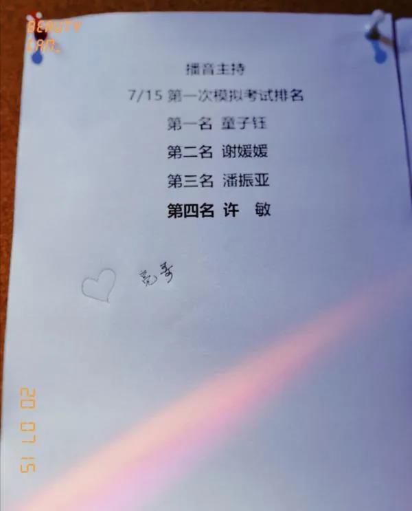 播音专业进行了第一次模拟考试,海亮老师为每个学生打分,还制作了排名表,激励我们彼此学习、共同进步。